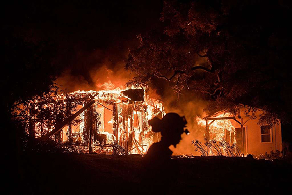 This is the “casita,” a former shop turned into 180-sq.-ft. bungalow, and my “bedroom” separate from the 500-sq.-ft. cottage that we called the “main house.” Lynne and I were married on the porch in a home wedding, and I am taking credit for the beautiful swirls in the flames because I put three coats of latex paint on this wall just before we moved out almost four years ago. Since then, it has been a weekend home and no one was there when it burned. This photo appeared first in San Francisco Chronicle online, but was quickly purchased by Getty Images and went out into the world. It showed up the “poster child” for the wine country fires behind headlines on cnn.com, msn.com, and bloomsberg.com, to name a few. I am a regular reader of CNN.com, and the first time this showed up on my smart phone unexpectedly, I was a little chilled. I recognized this burning building but did not know why.